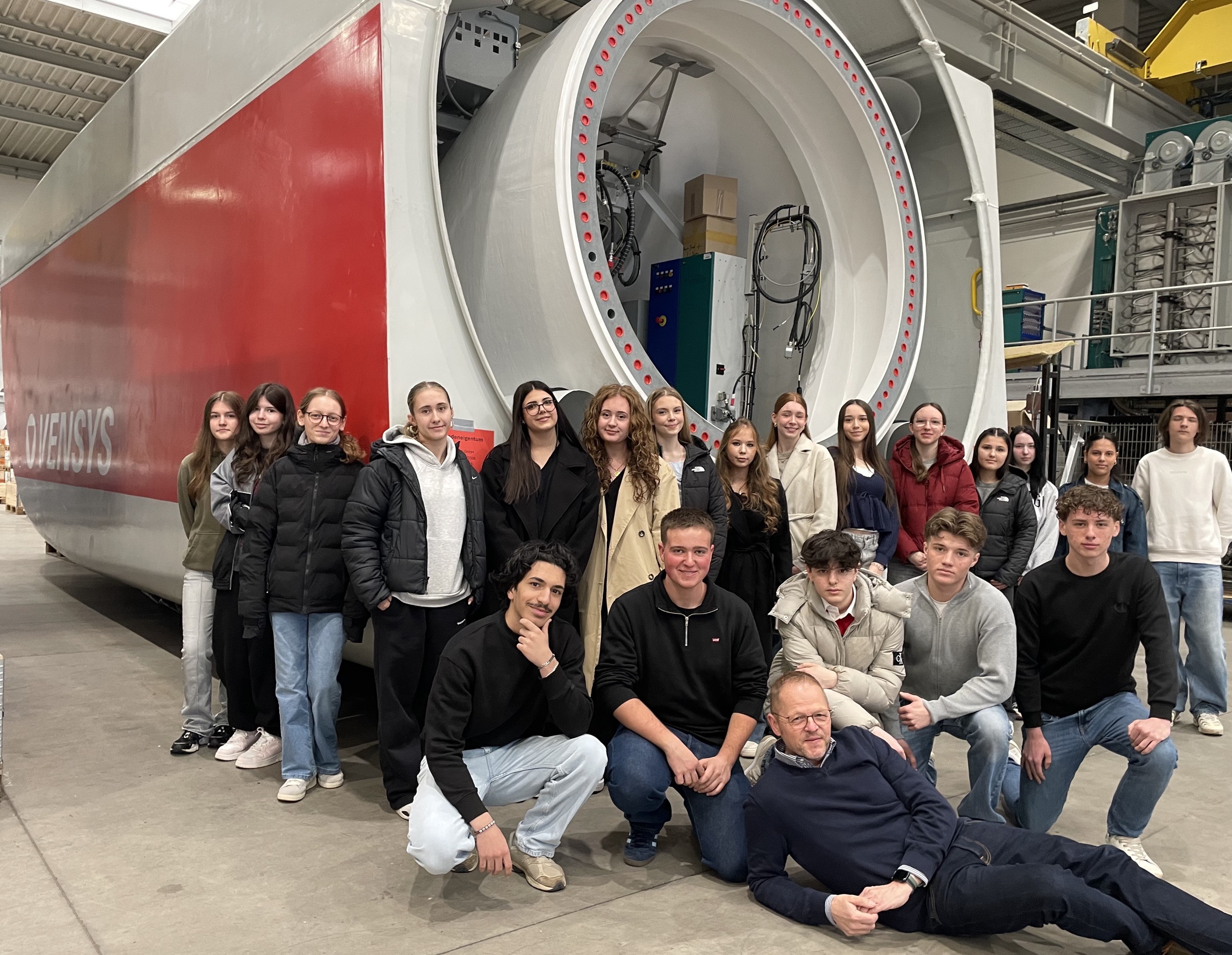 Auf Einladung des Klima Projekt Neunkirchen war die „Klasse 10 Ek Groben“ des Gymnasiums am Steinwald zu Besuch beim Windenergieanlagenbauer Vensys Energy AG in Wellesweiler. Dort konnten sich die Schülerinnen und Schüler mit ihrem Lehrer Peter Groben ein Bild über die Windenergieanlagen, ihre spezifischen Besonderheiten und über die Produktionsstätte machen. Vensys-Mitarbeiter Torsten Sigmund erläuterte in einem sehr interessanten wie auch kurzweiligem Vortrag, wie aus Wind erneuerbarer Strom erzeugt werden kann und welche weiteren Herausforderungen im Bezug auf die Energiewende noch auf uns warten. Um den Schülerinnen und Schülern auch noch einen tatsächlichen Eindruck von der Stromproduktion zu vermitteln können, wurde auch noch der Windpark „Schiffweilerwies“ an der B 41 besucht. Dort wurden die Gymnasiasten von Jacques Péry vom Windparkbetreiber Enovos begrüßt und mit Infos rund um den Windpark versorgt. Zudem konnten die Schüler auch noch einen nicht alltäglichen Blick in das Innenleben einer Anlage werfen.